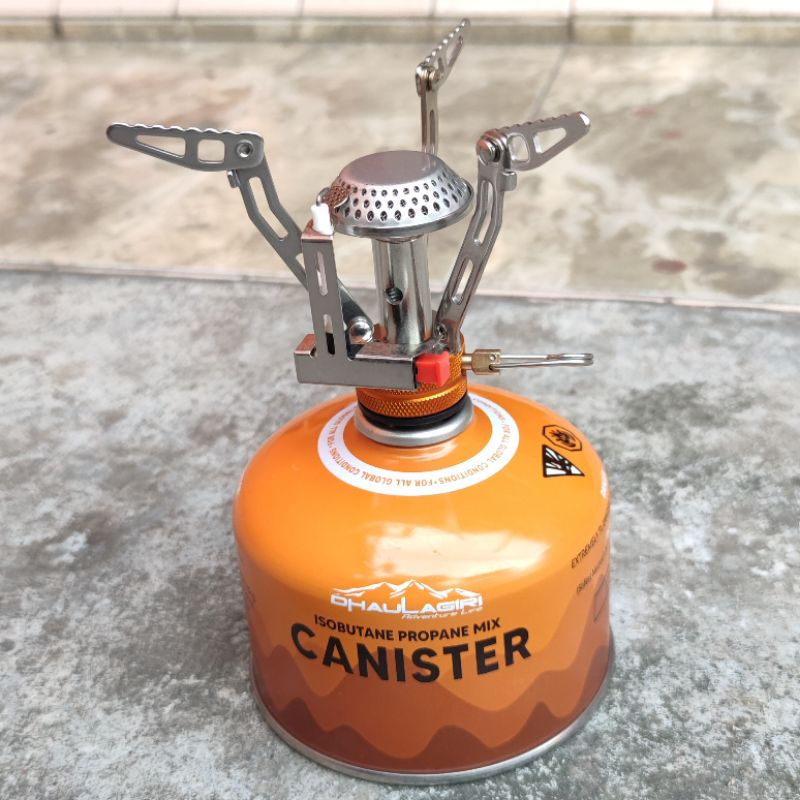 Ini tipe paling laris di gunung-gunung Jawa seperti Semeru, Rinjani, atau Merbabu. Bentuknya kecil seperti kaleng sarden, pakai tabung gas camping (biasanya 220–450 gram). Nyalanya cepat, api stabil, dan bobot total (plus tabung) hanya sekitar 300–600 gram. Cocok untuk pendakian 1–3 hari.