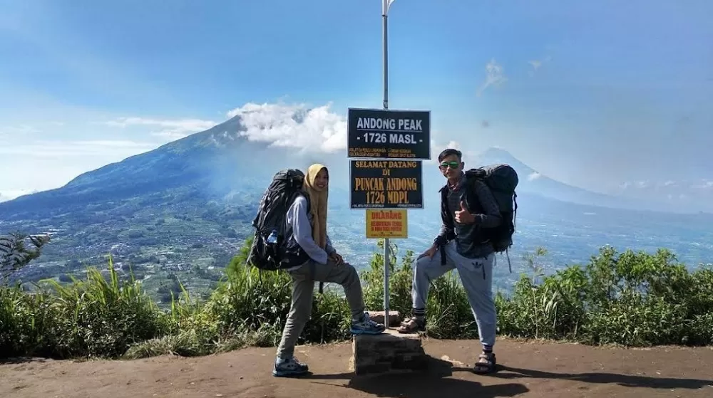 Ketinggian: 1.726 mdpl Durasi: 1–2 jam naik Kelebihan: Sangat cocok untuk pemula absolut. Trek landai, banyak warung di jalur, dan puncaknya punya spot foto ikonik dengan batu jepit. Cocok buat latihan sebelum naik gunung lebih tinggi. Biaya: Rp10.000–Rp15.000.
